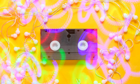 Retro vhs video tape with bright glowing led garlands on a yellow background. Light effect Top view, minimalism