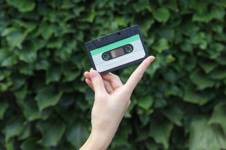 Hand holding retro audio cassette on green leaves wall background