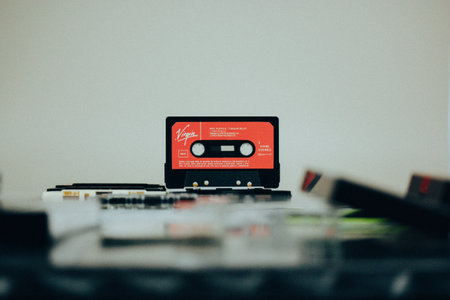 A worn cassette tape sits against a dark backdrop, reminding one of classic songs and forgotten tales from the past.