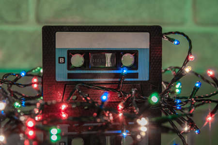 An audio cassette in a black plastic case is reflected on a black matte surface. Colorful lights are garlanded around it. Close-up
