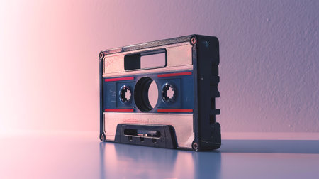 Retro styled cassette tape on a pink background. Vintage audio tape with a nostalgic feel. Concept of retro music, analog technology, audio recording, and 80s nostalgia.