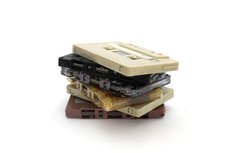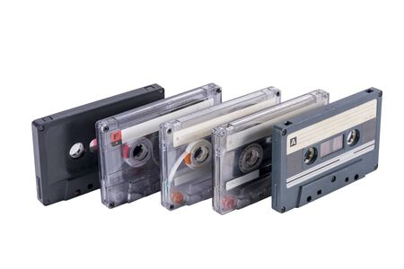 Collection of old audio cassette tapes isolated on white background, vintage music and technology concept