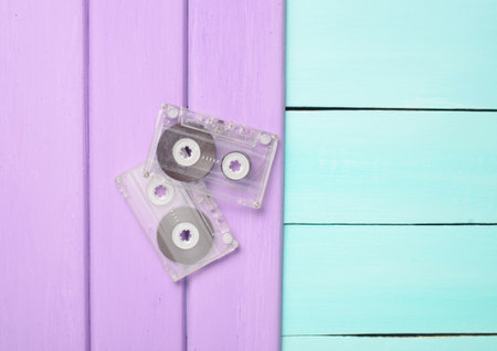 Two retro audio cassettes from the 80s on a blue violet wooden background. Top view.