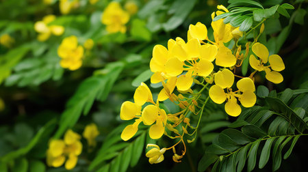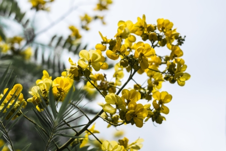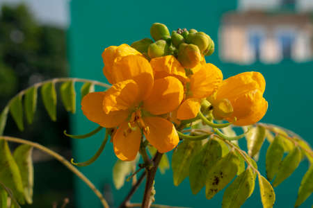 Yellow Senna flowers and green leaves closeup shot at a park in Delhi