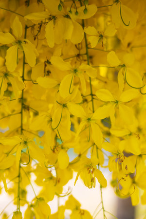 Ratchaphruek or Multiply flowers, Cassia fistula L. or golden shower are blooming on the tree. Tropical yellow flowers that bloom in summer. Symbol of Songkran Festival.