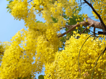 blooming flowers of the Golden Shower Tree(Golden Shower Senna,Indian Laburnum,Pudding Pipe Tree),close-up of yellow flowers blooming on the branches with blue sky background