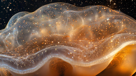 Macro shot of iridescent seashells floating in calm water, surrounded by tiny bubbles and soft ripples