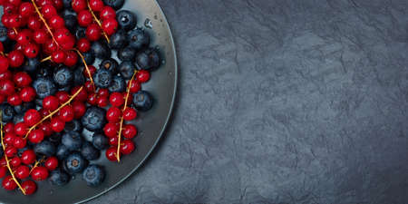 Berries in a black plate. Currants and blueberries on a black slate table. View from above. Place for text