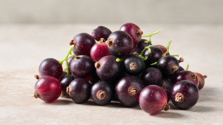 A beautiful arrangement of fresh blackcurrant berries and branch on a neutral stone surface, perfect for culinary or healthy lifestyle themed images. Ideal for food photography.
