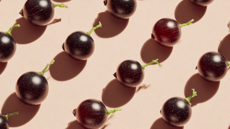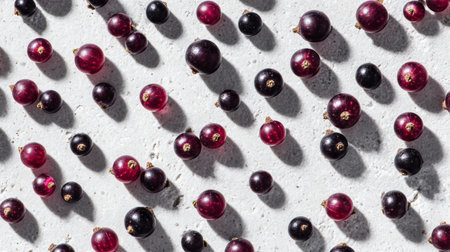 A beautiful arrangement of fresh black and red currants creates a stunning pattern against a pastel background, showcasing shadows and natural textures perfect for food-inspired projects.