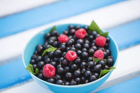 Black currants and raspberries in a bowl