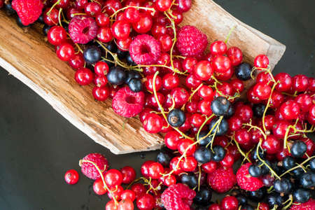 mix of summer organic berries strawberries, raspberries, black and red currant, gooseberries, agriculture and gardening. Harvest Concept