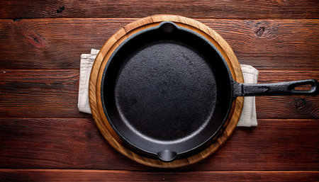 A dark cast iron skillet rests on a textured background, perfect for culinary photography. Ideal for showcasing cooking, home chef lifestyle, and rustic kitchen designs.