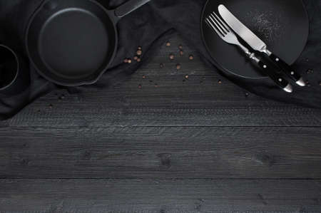 Black background with empty fryed pan and cutlery on the linen tablecloth, dark wooden table. Copy space