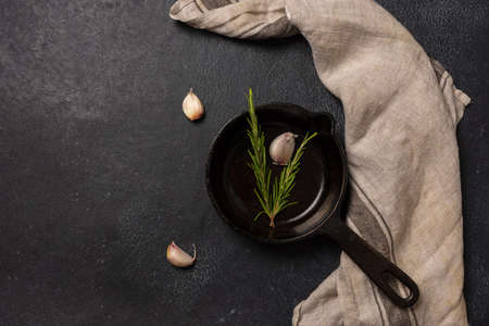 Empty black cast iron frying pan on a dark graphite background. Light linen towel. Fresh rosemary.