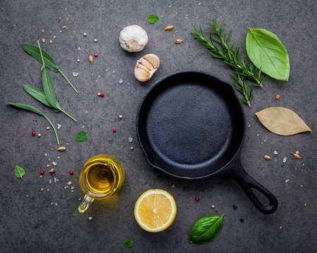 Empty old cast iron skille on dark stone background. Ingredients for making steak concept with copy space . Various herbs and seasoning rosemary ,sage ,bay leaves ,basil ,garlic and peppercorn.