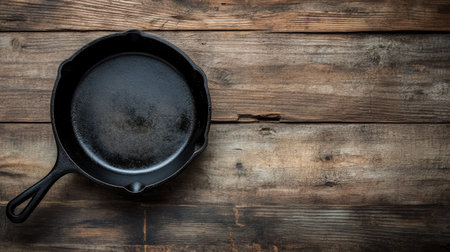 Fresh black cast-iron skillet on a wooden background. place for text