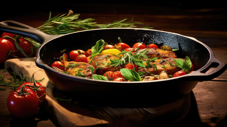 A cozy kitchen scene featuring a cast-iron skillet with sizzling meat, surrounded by fresh ingredients like onions and garlic, capturing the essence of home-cooked meals