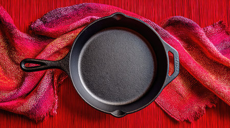 A cast iron skillet rests gracefully on a richly textured red textile, creating a striking culinary display perfect for cooking enthusiasts and chefs alike.