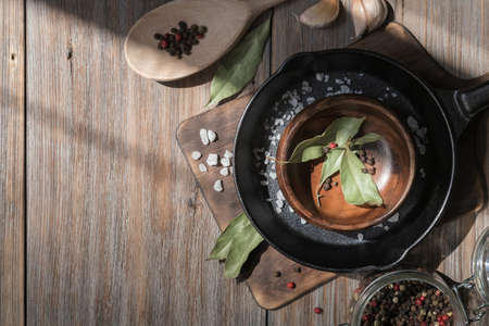 Cast iron pan for frying and cooking with salt, garlic, spices, bay leaf and pepper on a rustic loft wooden table. Kitchen food background with copy space for menu or recipe top view.