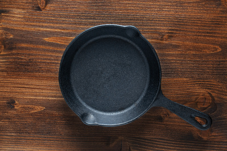 Traditional cast iron skillet pan on vintage wooden table background.