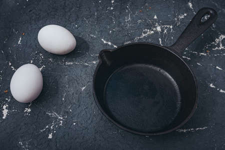 Empty skillet, frying pan with copy space for text or food with copy space for text or food, top view flat lay , on black dark stone table background