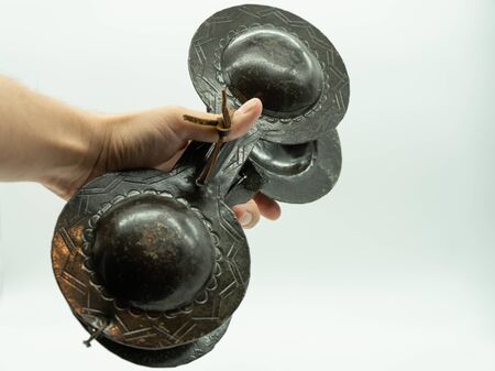 Spanish castanets in the hands on white background, close up. Percussion instrument used in flamenco, sevillanas dance in Spain, isolated, close up. Hands detail of flamenco dancer with castanets.