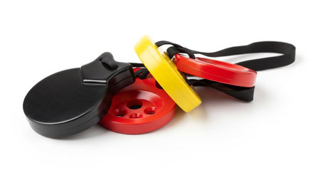 Spanish clappers with yellow and red strings isolated over white