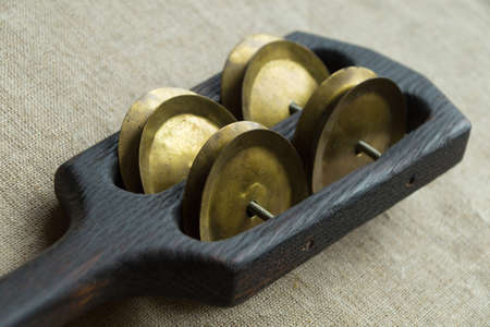 The upper part of the wooden folk noise musical instrument rhythm clapper (rumba, pandeiro) close-up - frame with four pairs of metallic cymbals