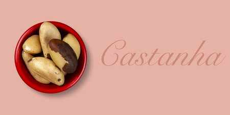 Red Bowl with culinary ingredients chestnut (text in Portuguese) on light brown background