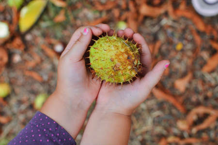 The baby is holding a prickly chestnut in her hand. Autumn photo of a child. Moments of childhood.