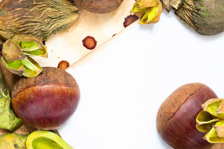 A background with fresh raw chestnuts and dried plants and place for your text.