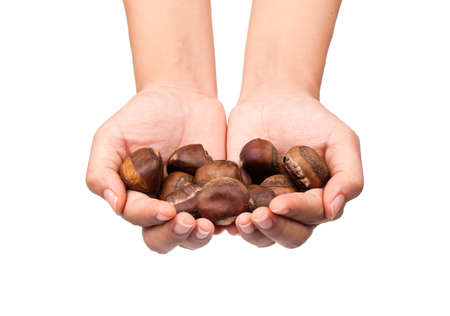 Photo of a womans hands full of chestnuts on a white background.The photograph is shot in horizontal format and has a large space for copy space.