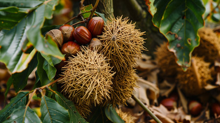 Ripe Chestnuts on Chestnut Tree in Autumn