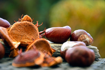 Chestnuts and acorn nuts in close-up in a moody autumn setting