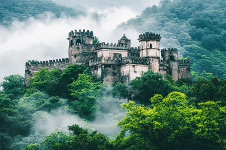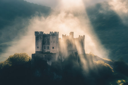 Majestic ancient castle perched atop a rugged hill, surrounded by dense fog and dramatic lighting