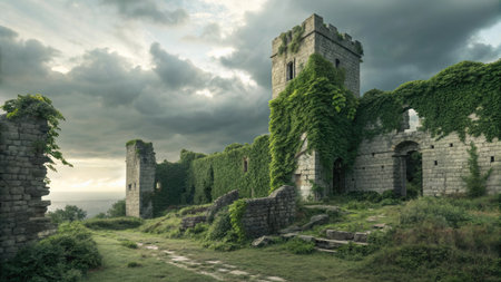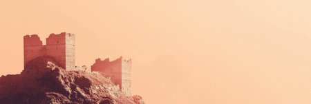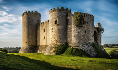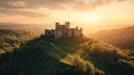 An ancient castle perches on a hilltop bathed in warm sunlight, offering tranquility and a panoramic view. Perfect backdrop for any project.