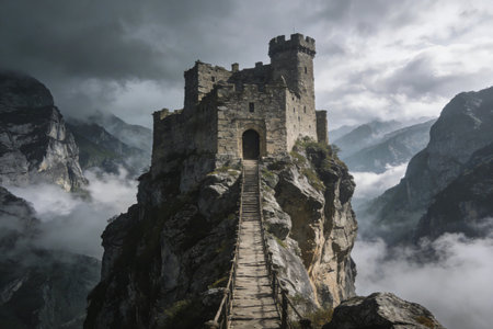 This captivating image showcases a medieval castle tower perched dramatically on a rocky cliff, shrouded in mystical fog. The blend of nature and history creates a serene yet intriguing atmosphere, perfect for transporting viewers to a bygone era.