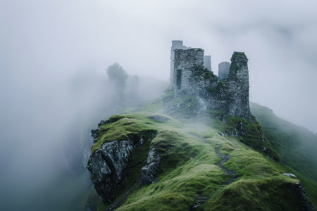 A castle stands proudly on top of a vibrant green hill, commanding a majestic view, Ancient castle ruins on a mist-covered hill, AI Generated