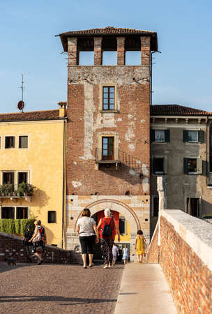 VERONA (VR), ITALY - MAY 10, 2019: tourists visiting The Scaliger Bridge in Verona, city of lovers in Italy