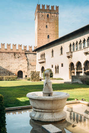 A fountain and garden between fortified walls at Castle Fortress Castelvecchio in Verona, northern Italy on September 14, 2014. Castelvecchio is a castle and is now home to the Castelvecchio Museum.