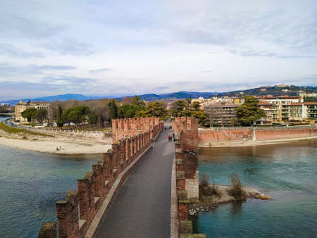 Verona, Italy - Febuary 20, 2016: Ponte di Castel Vecchio (Scaliger Bridge), a fortified bridge in Verona, northern Italy, over the Adige River. It is part of the fortress of Castelvecchio.