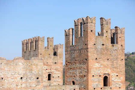 Swallowtail battlements or merlons and red brickwork of Castelvecchio, a medieval castle in Verona, Italy, showcasing fortified architecture and the historic military heritage