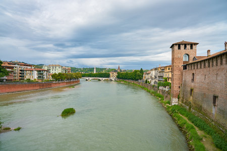 Verona, Italy. Scenery with Adige River and Ponte Scaligero and Castelvecchio,
