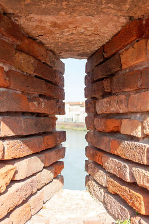 A tower of an old medieval fortress through an embrasure hole in a brown brick wall