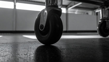 silhouette of matte black shopping cart wheel with bright white backlight creating halo glow, placed on dark textured stone surface, minimal conceptual retail setup