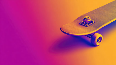 A skateboard is positioned on a colorful gradient background of purple and yellow hues. The image shows the skateboard's deck and wheels with soft lighting. The composition suggests dynamism suitable for advertising and design projects. The overall design offers visual appeal, and space for use in various visual communications.