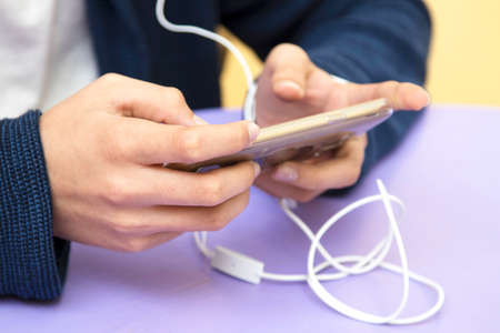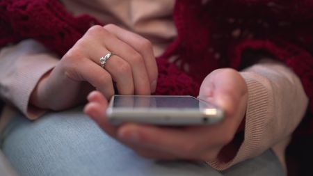 Girl surfing the Internet using smartphone. Close-up. In the cafe.
