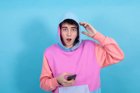 Close up hand man holding smartphone. A young person, man in casual grey shirt and shorts sitting and interacting with technology at home. Relaxation male using mobile phone.