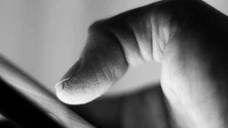 Male finger, damaged, wounded, sliding on a mobile phone.